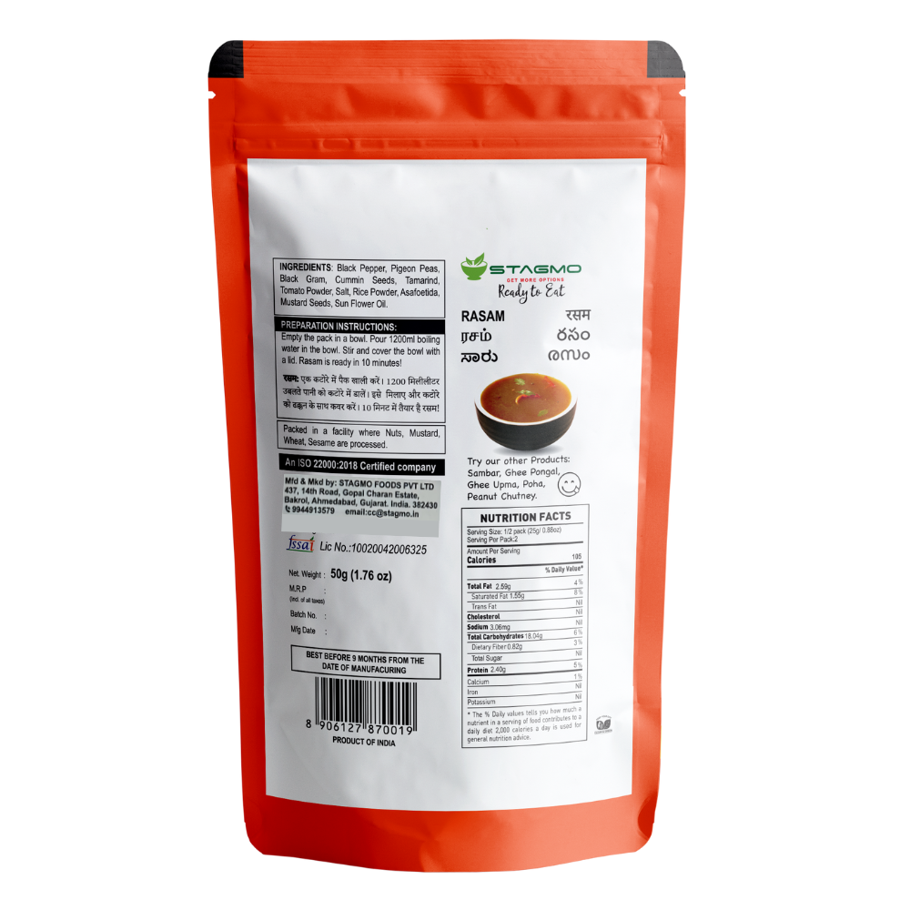 Rich in Antioxidants, Vitamins and Minerals, Rasam is everyone's favorite item. Made with quality ingredients - Black pepper, Cummin Seeds. Eat with rice or just have it like soup. Super easy to make, just add hot water and wait for few minutes, mouth watering Rasam is ready.